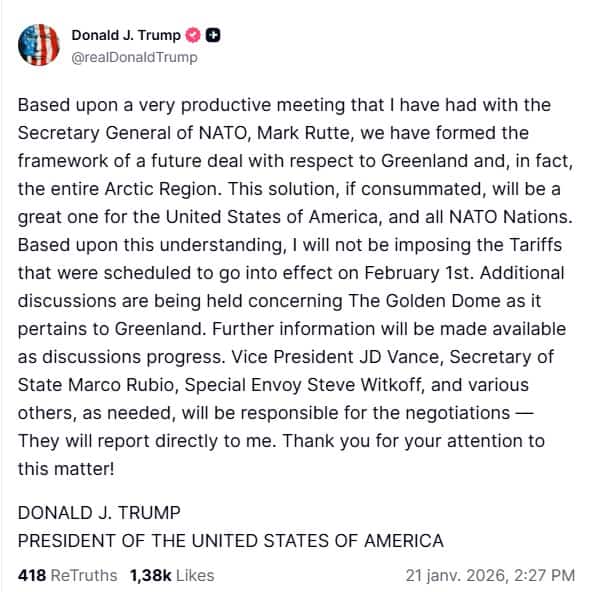 經過數週的宣布,甚至比上次更加激進,唐納德·特朗普週三在格陵蘭島達沃斯突然宣布了“未來條約框架”,並取消了與海關一起的軍事威脅。