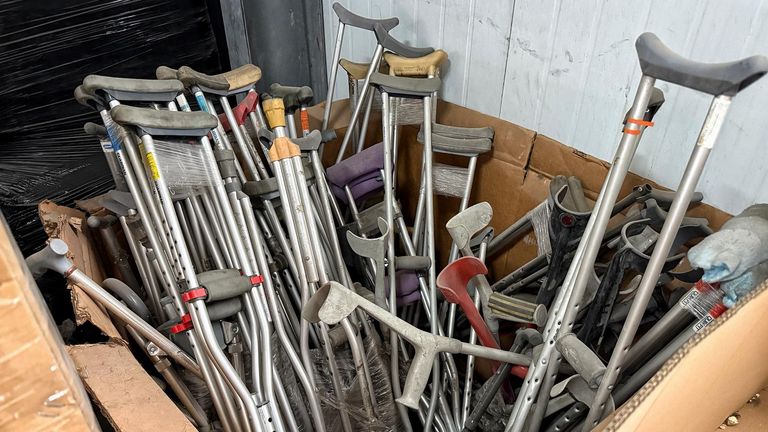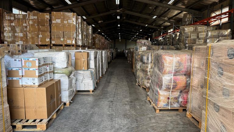 天空新聞看到約旦首都安曼的多個倉庫裡裝滿了運往加沙地帶的重要援助物資。