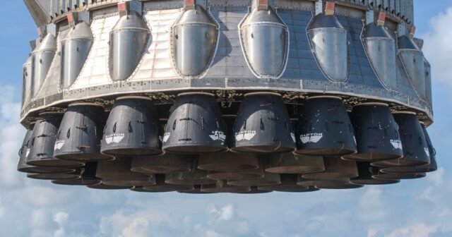 一張照片顯示了猛禽超重型助推器底部的 33 個發動機的特寫,而另一張照片則顯示了發射塔將助推器固定到位的巨型機械臂。這些與在之前的幾次飛行測試中將助推器固定在返回基地的所謂“筷子”相同,儘管即將到來的任務將看到超重型飛機在水面上進行受控著陸而不是返回基地。