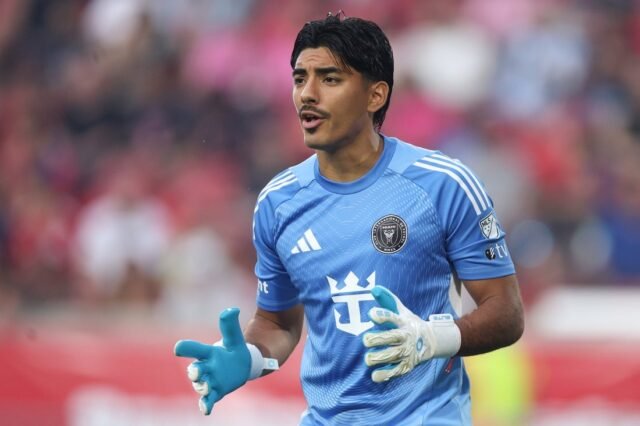 2025 年 7 月 19 日;哈里森,新澤西州,美國;邁阿密國際隊門將羅科·里奧斯·諾沃(Rocco Rios Novo,34 歲)在體育畫報體育場對陣紐約紅牛隊的上半場比賽中出場。強制信用:Vincent Carchetta-IMAGN Images