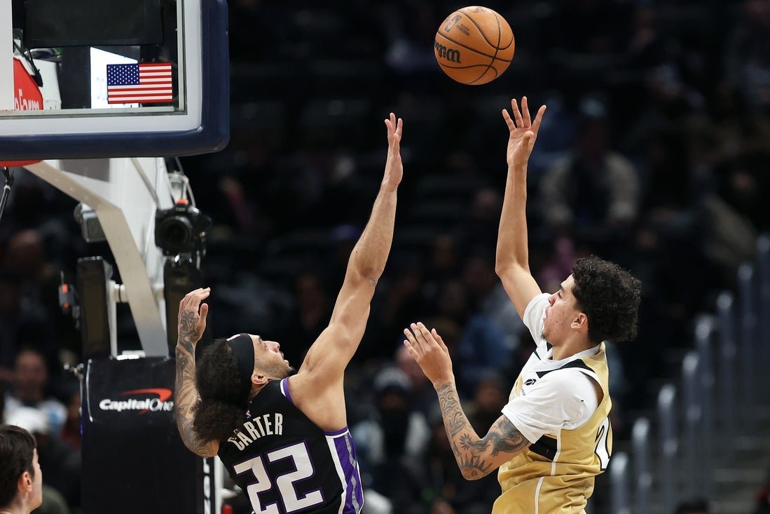 2026 年 2 月 1 日;華盛頓,哥倫比亞特區,美國;華盛頓奇才隊後衛威爾·萊利(27 歲)在第一資本球館下半場對薩克拉門托國王隊後衛迪昂·卡特(22 歲)投籃。強制學分:Daniel Cockayne Jr. I M I M I M I M I M I M I M I M I M I M I M I M I M I M I M I M I M I M I M I M I M I M I