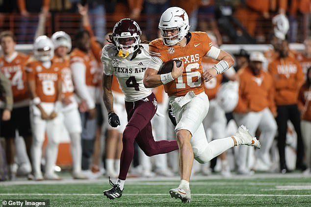 週五晚上,阿奇·曼寧 (Arch Manning) 傳球達陣,並在第四節末段衝刺得分,幫助 16 號德克薩斯大學 (Texas) 以 27-17 擊敗了 3 號德克薩斯農工大學 (Texas A&M)。